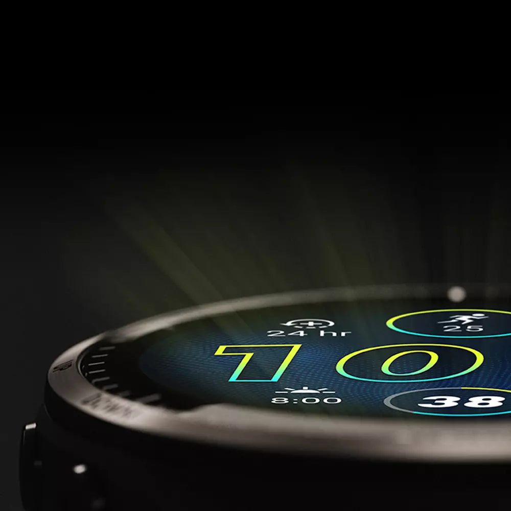 Brillantes AMOLED Touchdisplay in 1,4 Zoll. Zusätzliche Tastenbedienung zum intuitiven bedienen der Uhr während des Sports